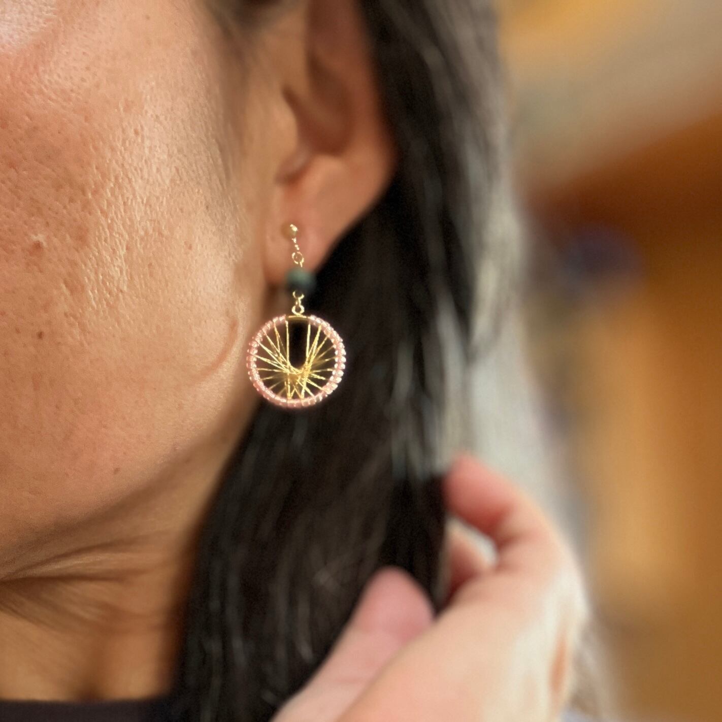日本伝統の藍や紅花で染めたビーズに、京都の老舗 寺島保太良商店の金糸をひとめひとめ丁寧に挟み込んで制作しております。