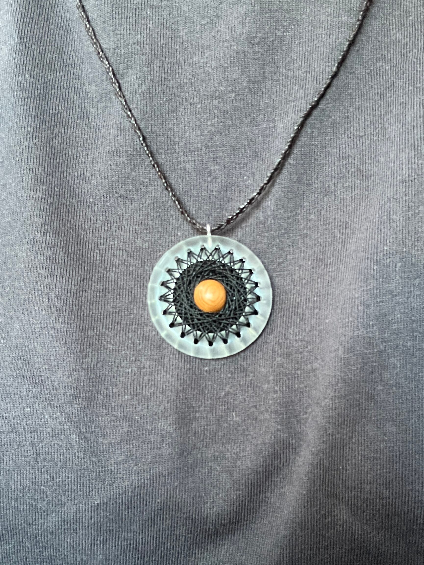 透明なリングにシルクの糸で曼荼羅模様を刺した、他にはないインパクトのあるペンダントです。