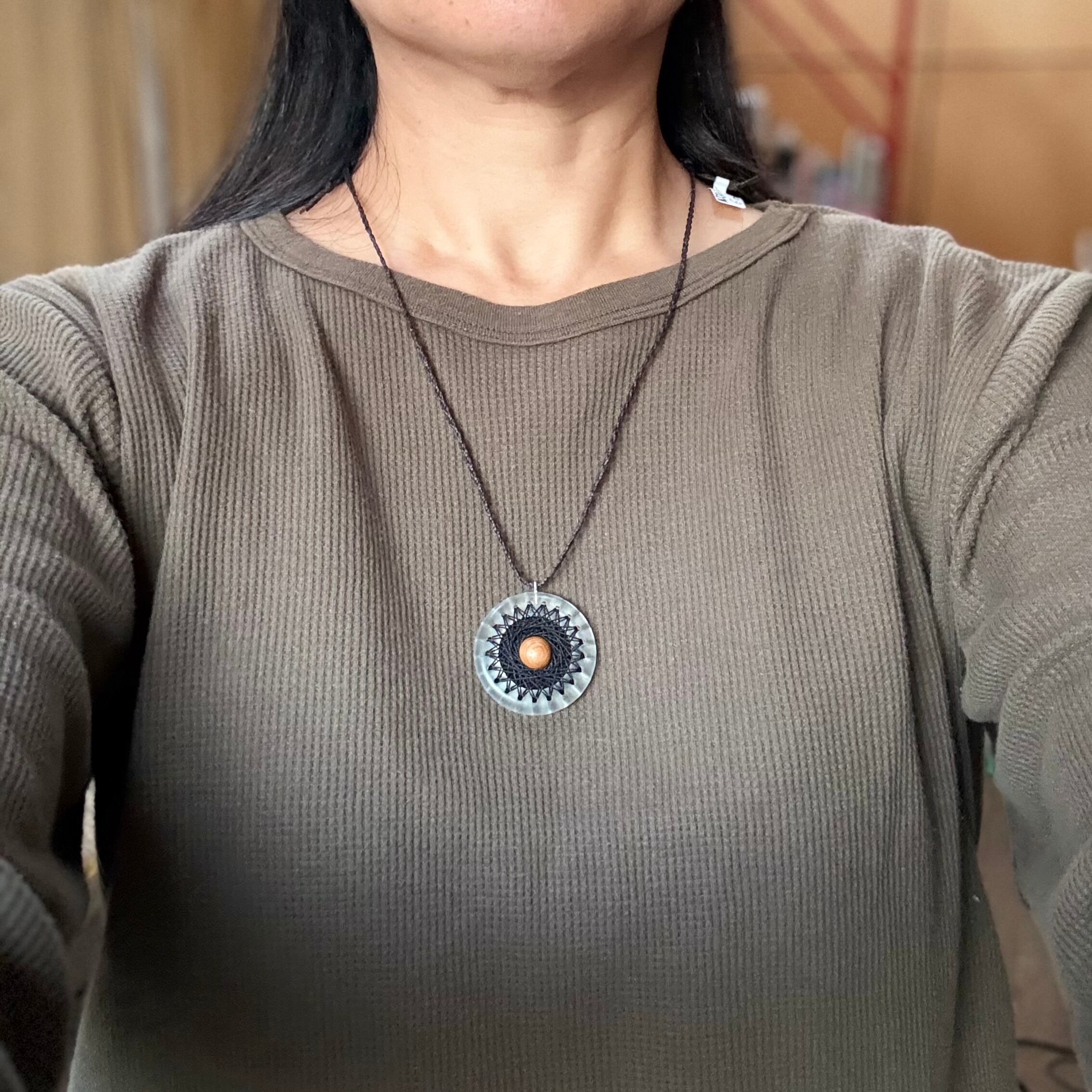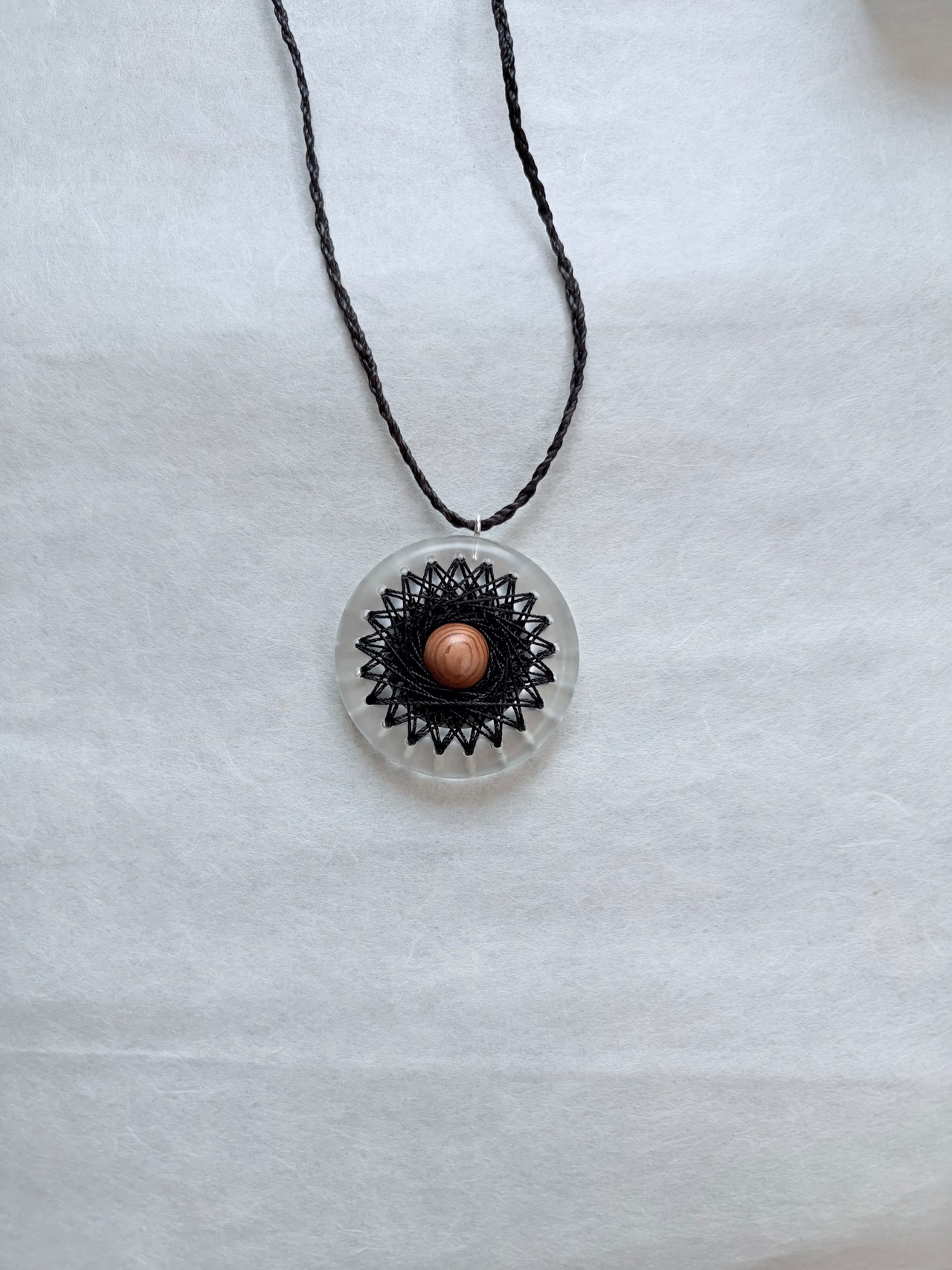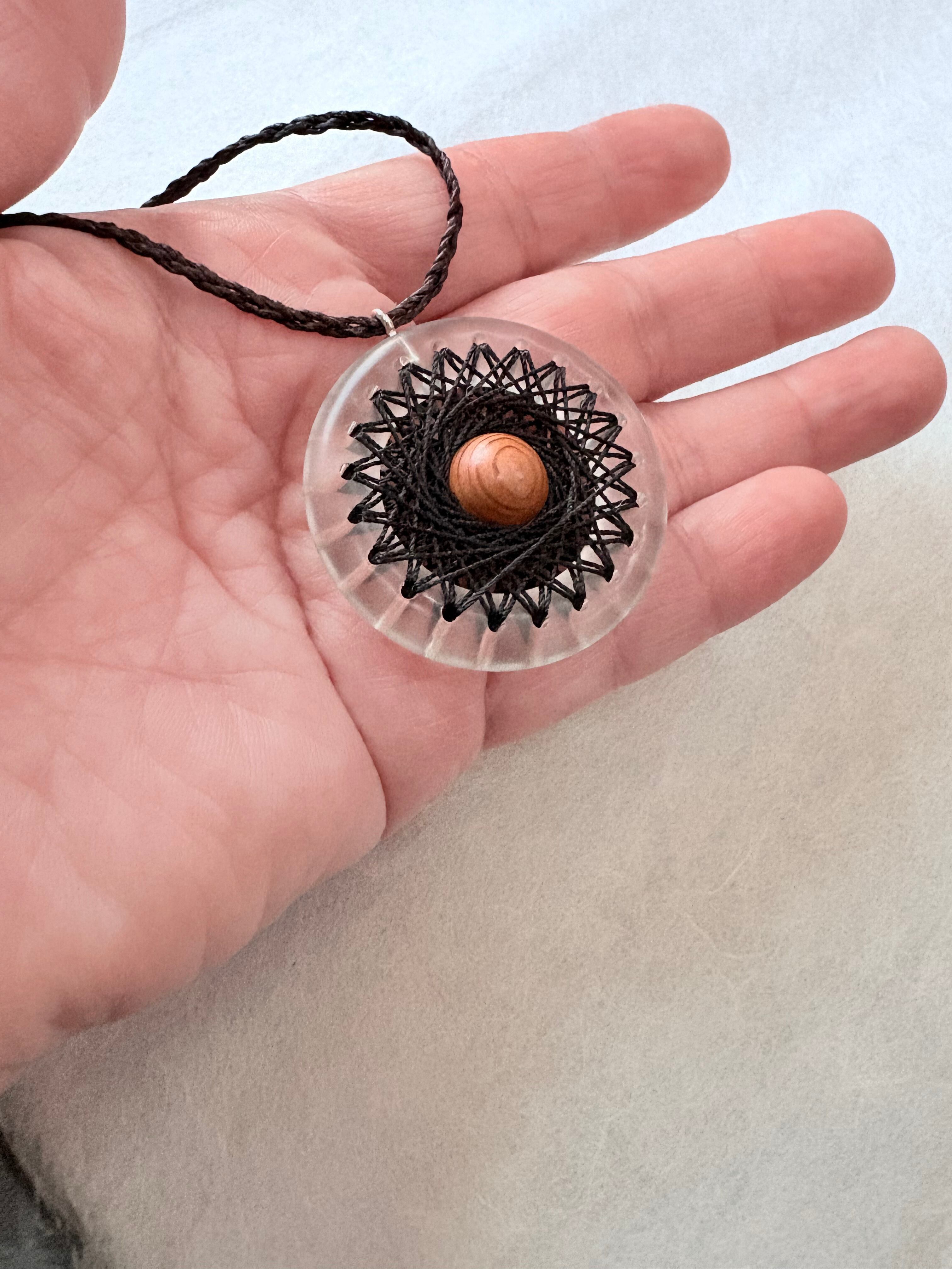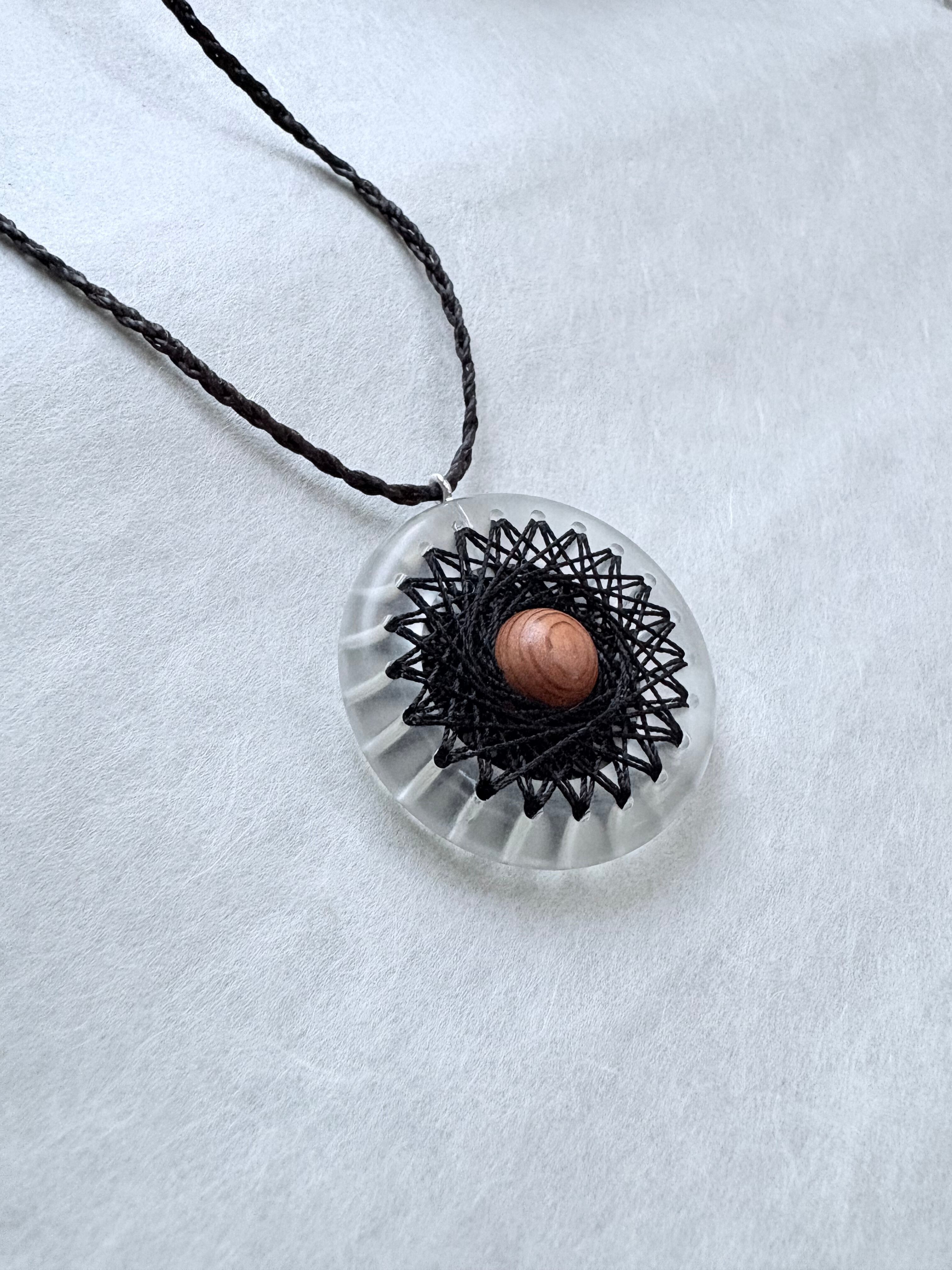透明なリングにシルクの糸で曼荼羅模様を刺した、他にはないインパクトのあるペンダントです。