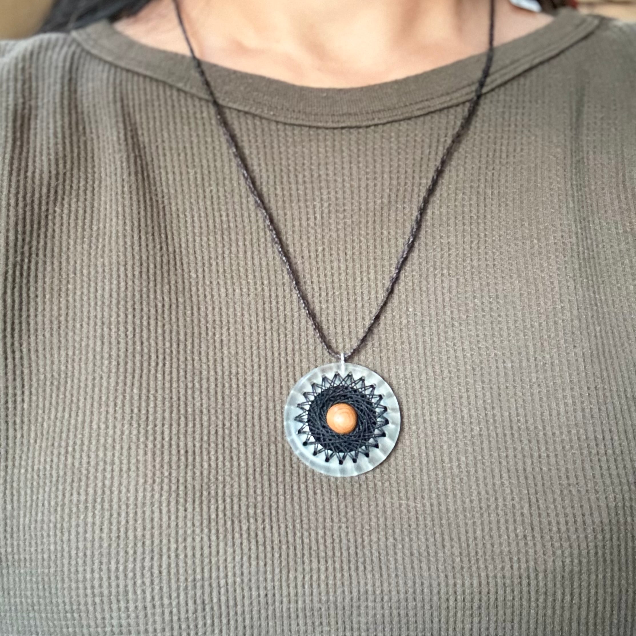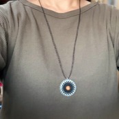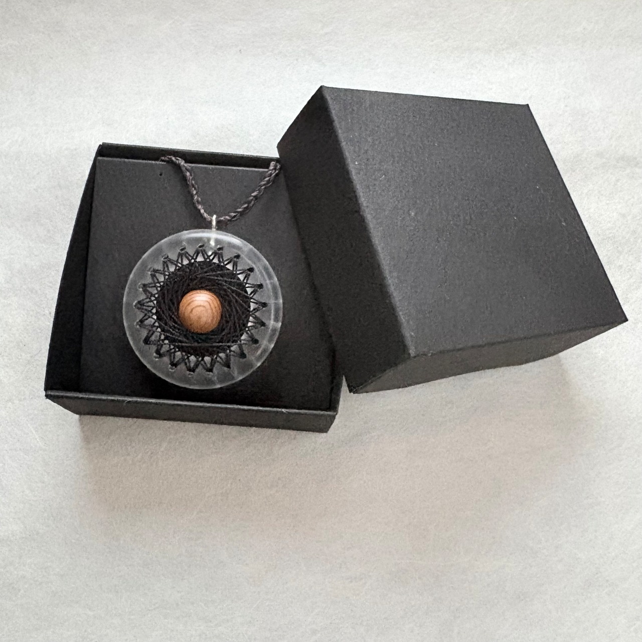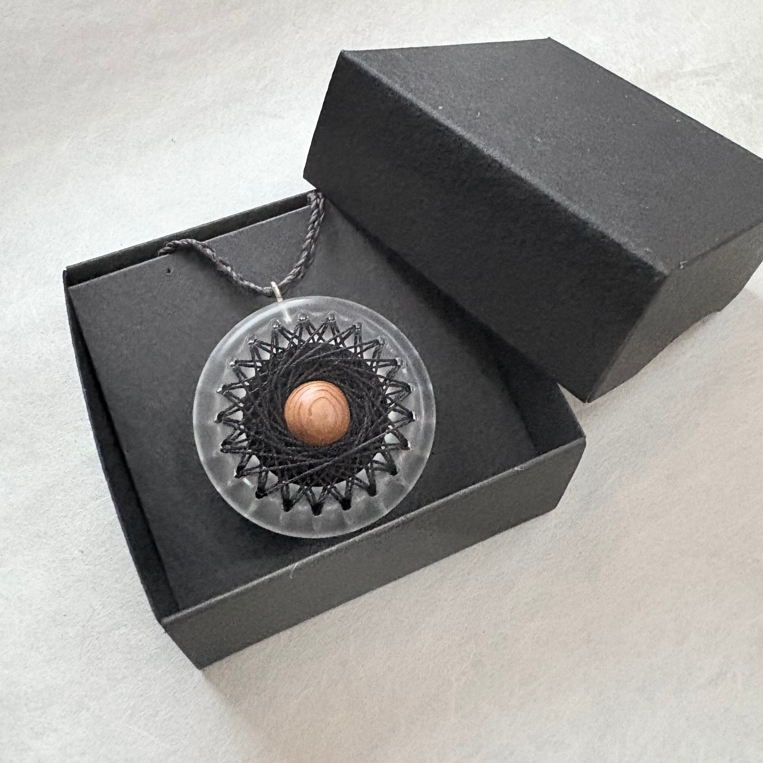 透明なリングにシルクの糸で曼荼羅模様を刺した、他にはないインパクトのあるペンダントです。
