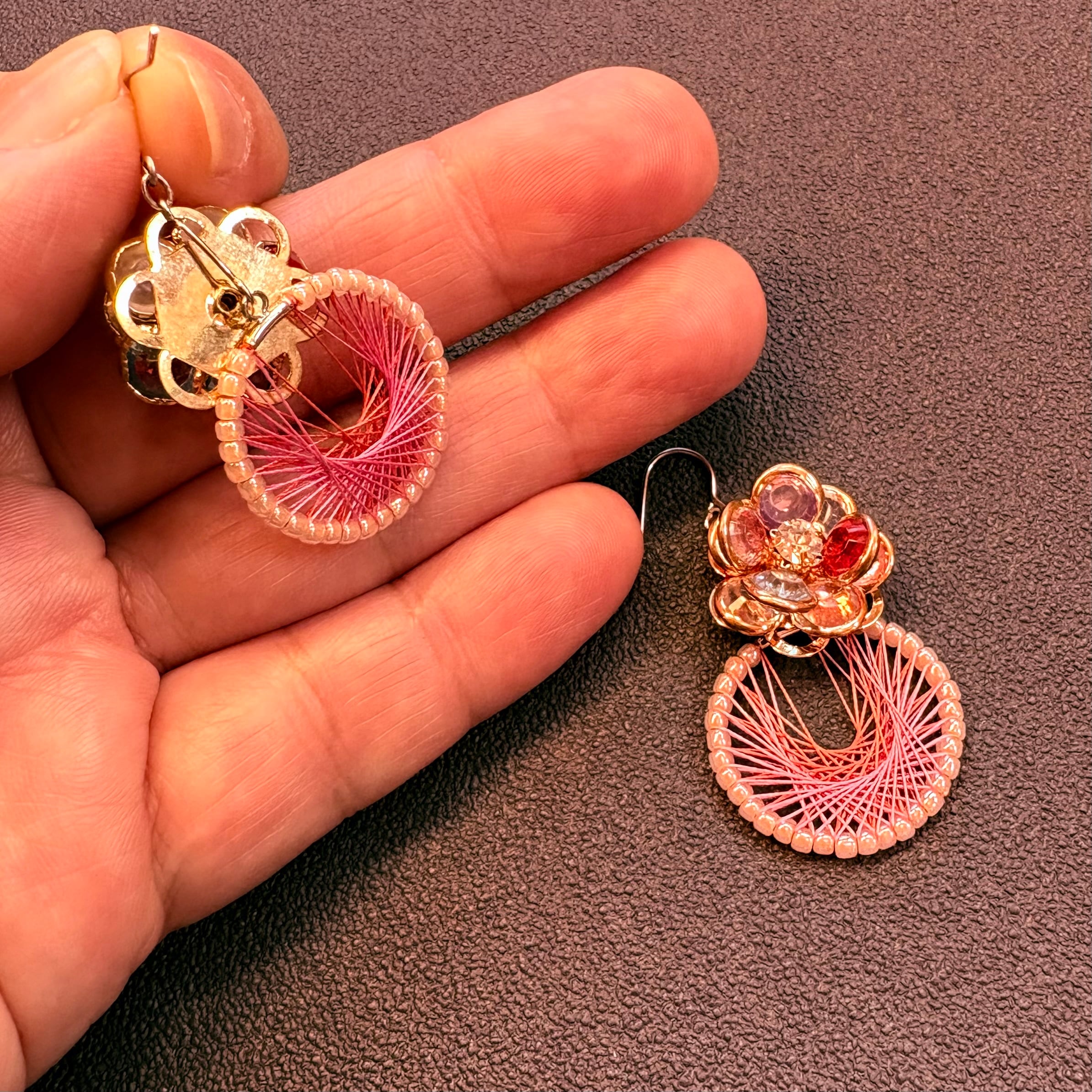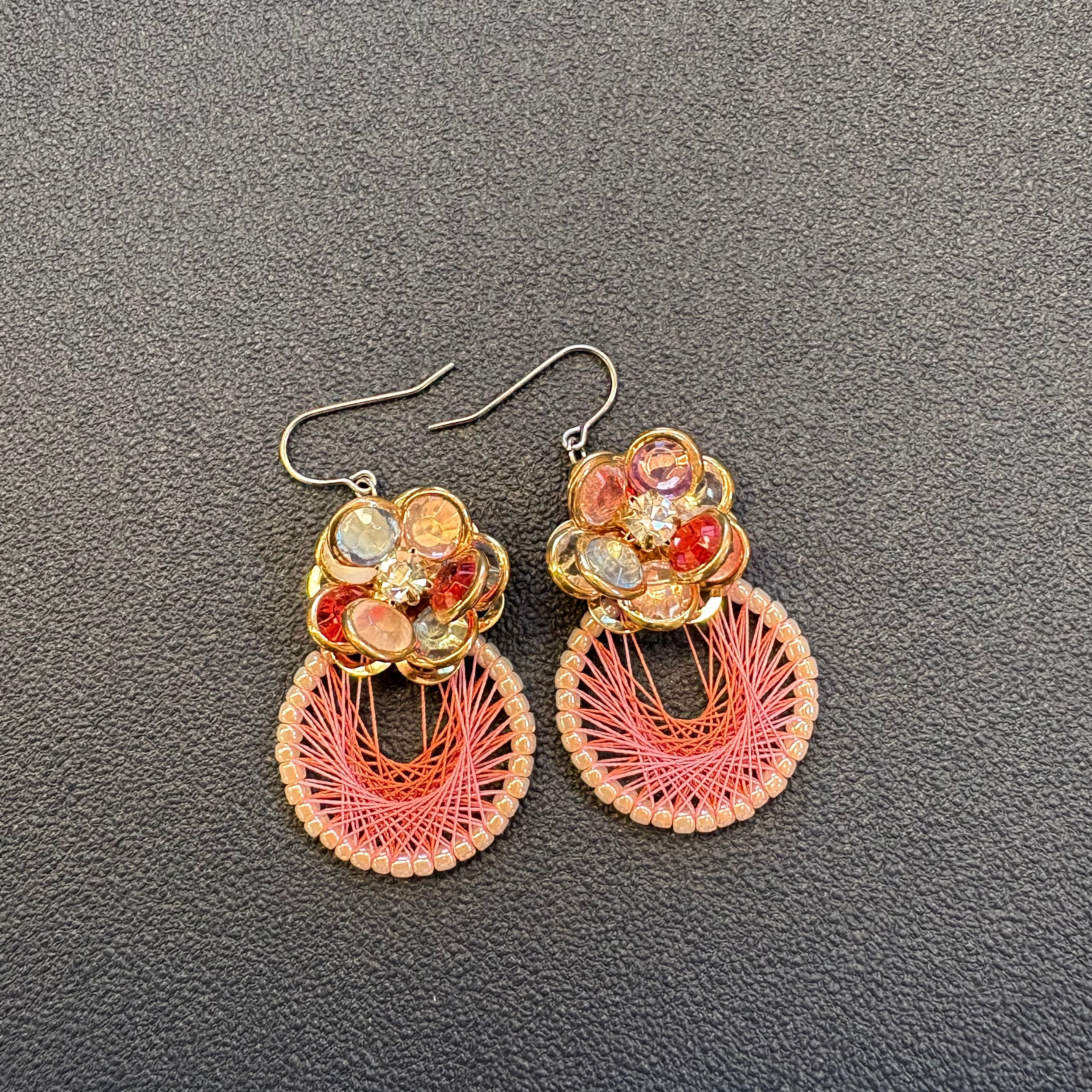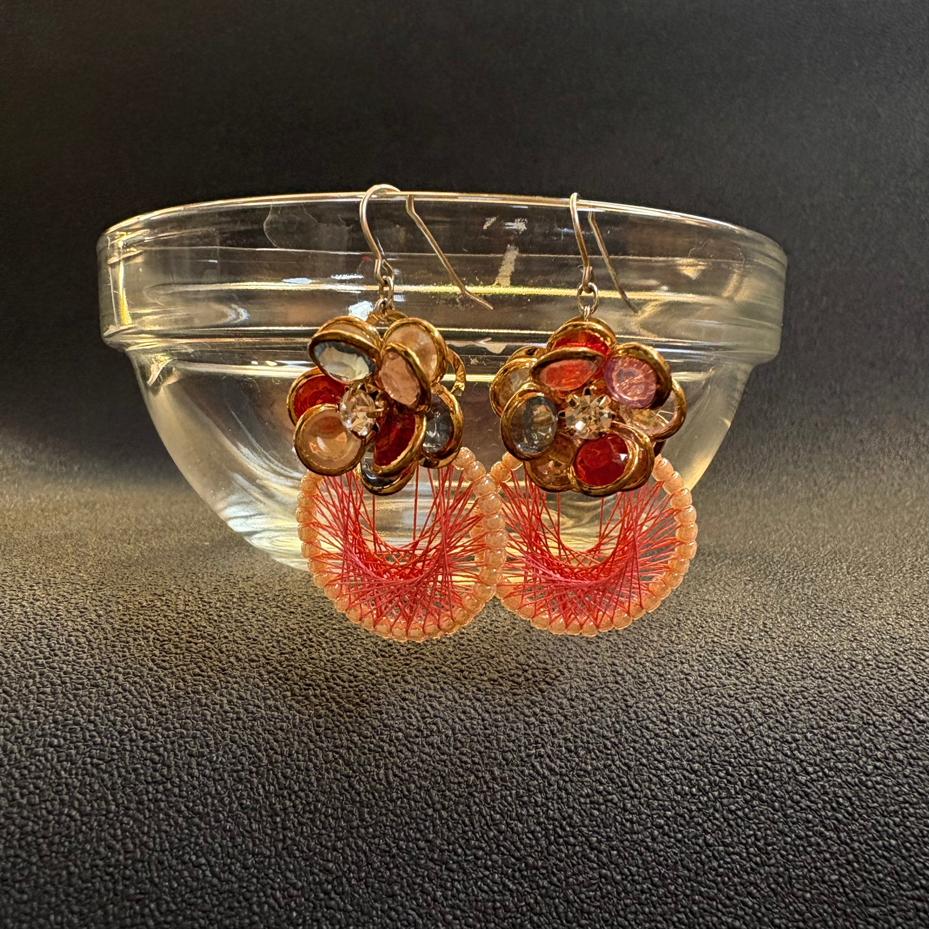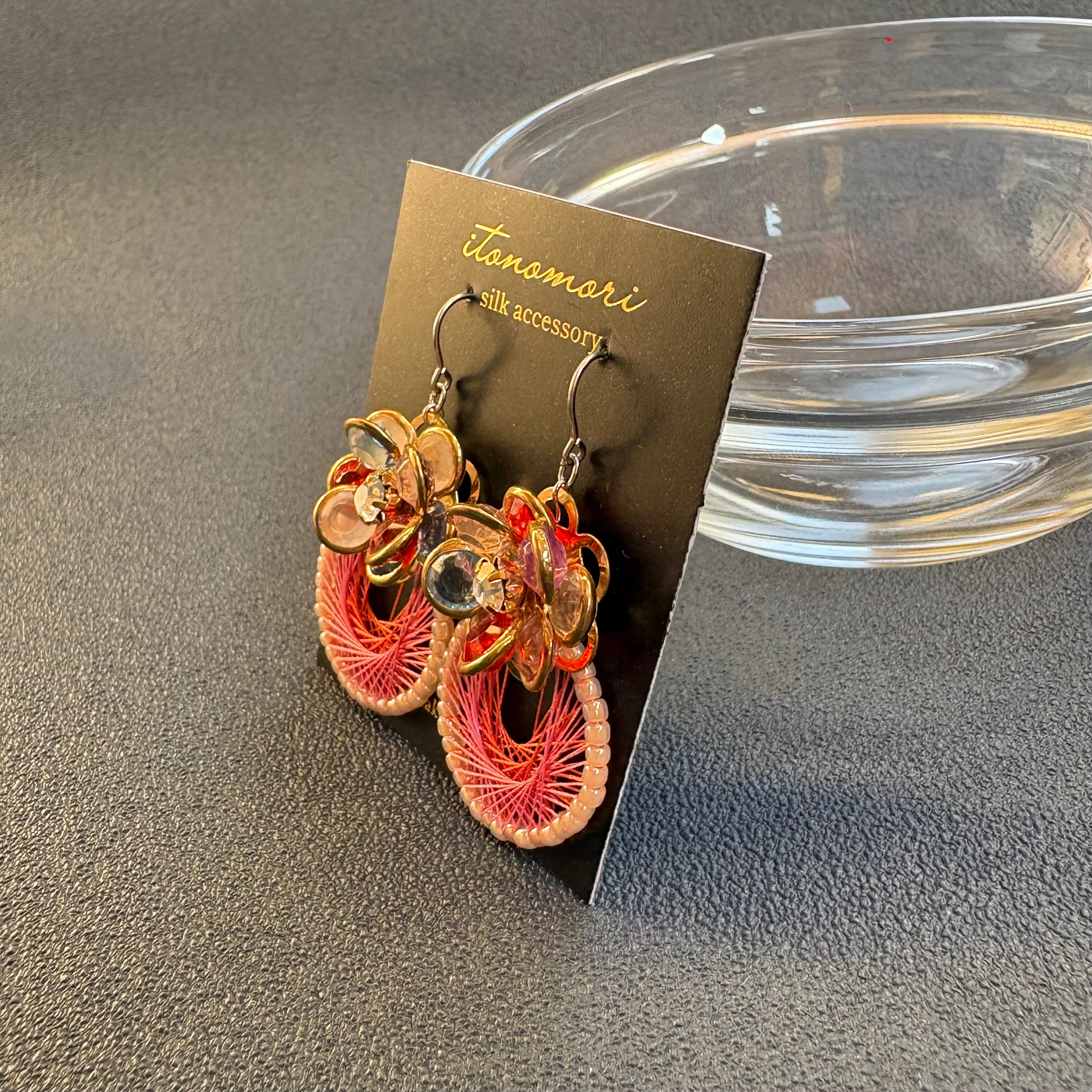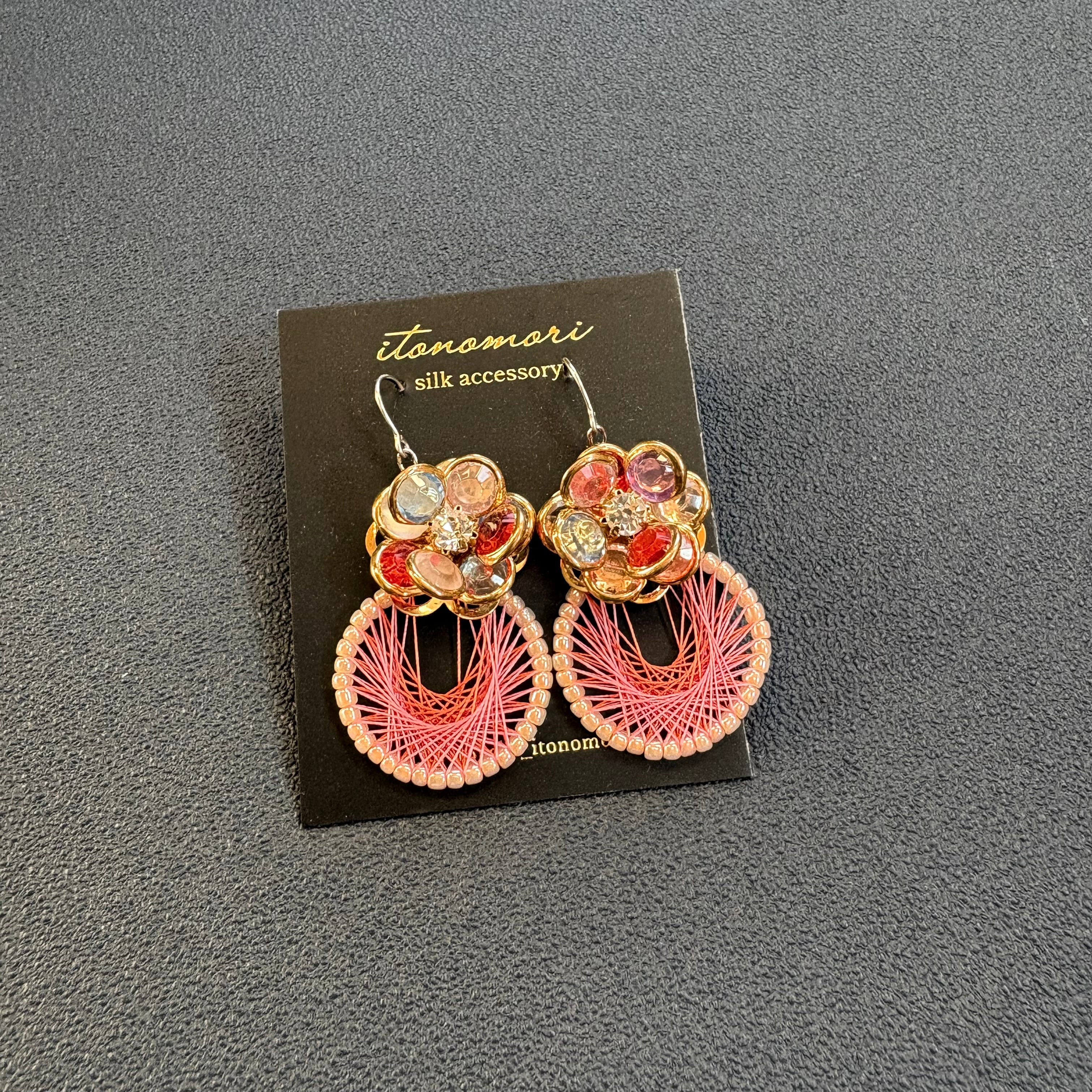 ピンクの絹糸とカラフルなお花のパーツで可愛らしく華やかな雰囲気に仕上げました。