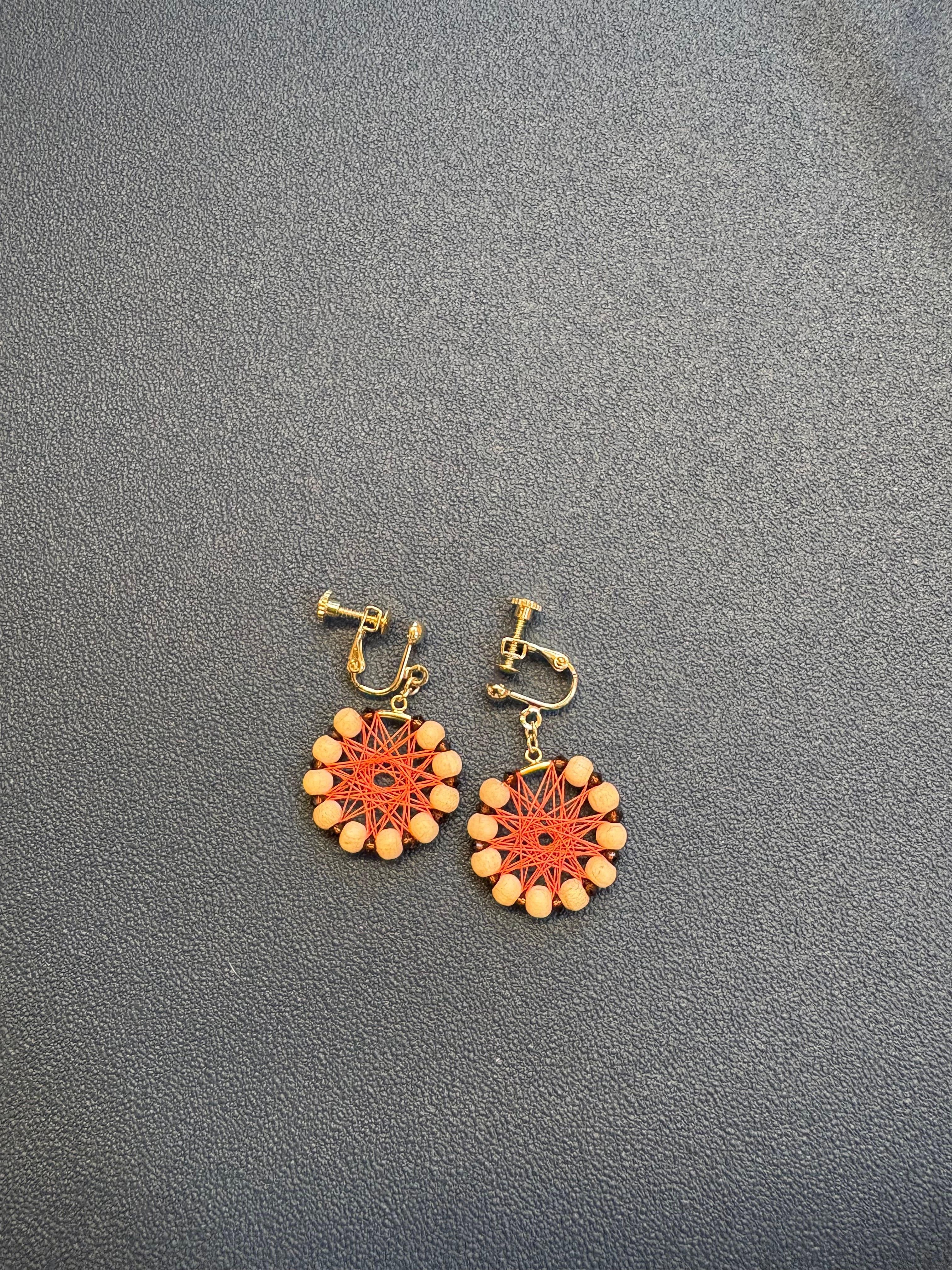 木のビーズとガラスビーズを交互に配し、曼荼羅のようにシルク糸をかけたナチュラルテイストなアクセサリーです。