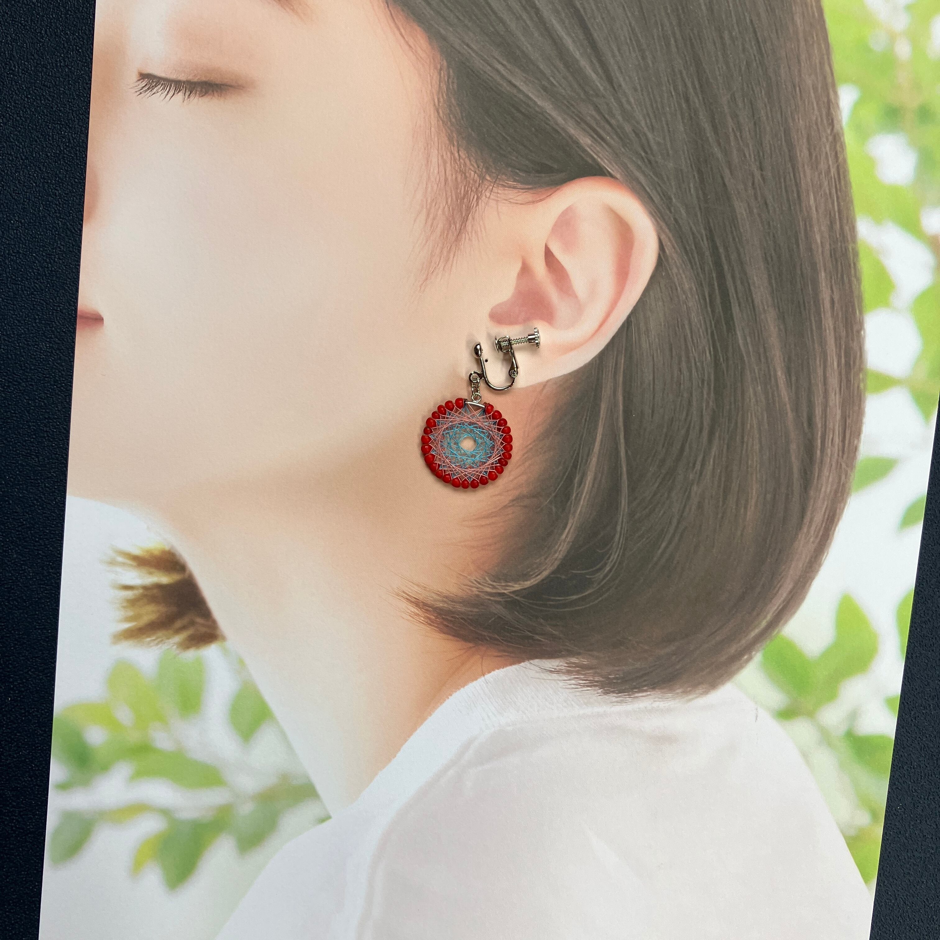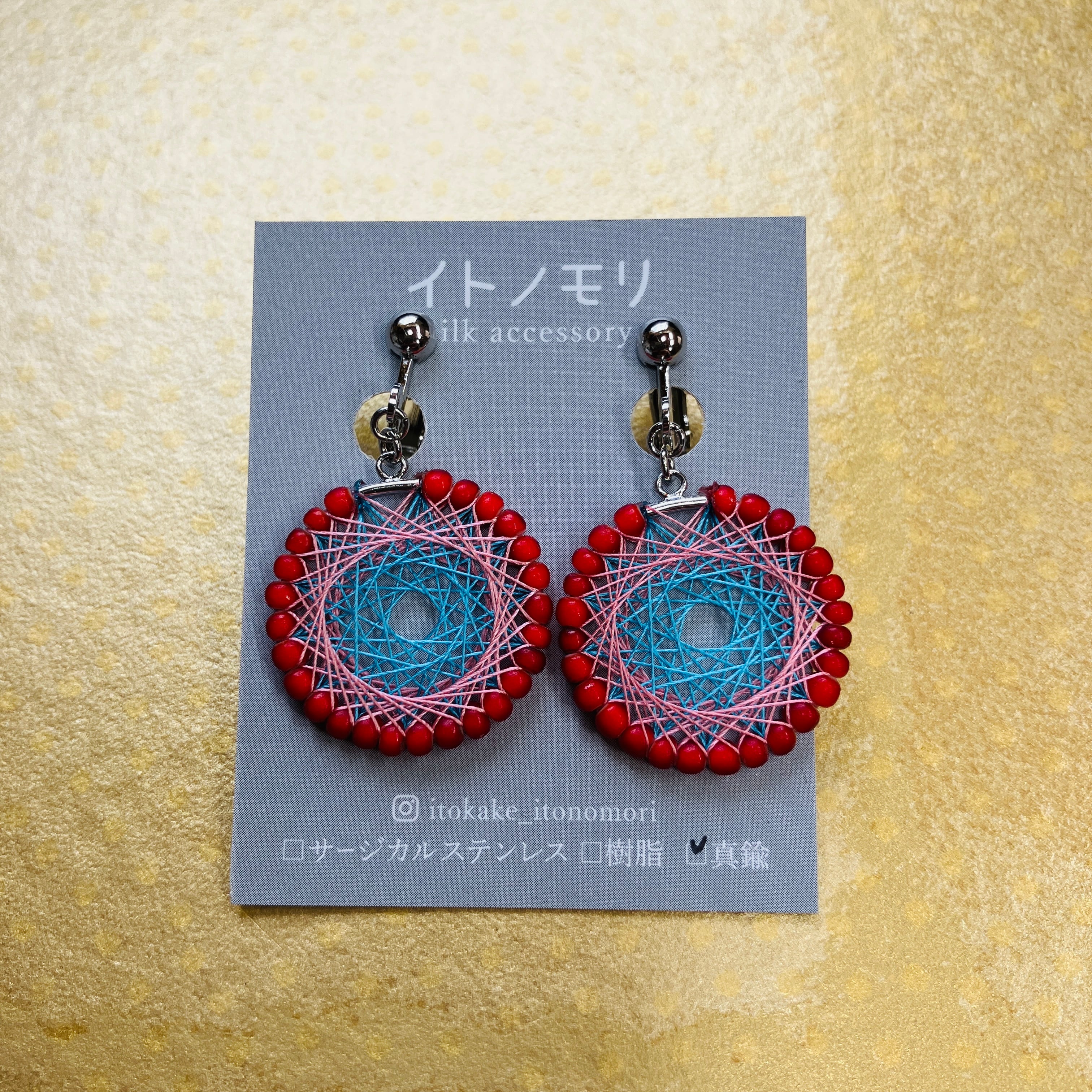 赤いビーズが目を惹くシルク糸のアクセサリー